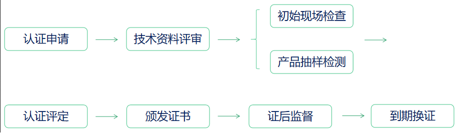 綠色產品認證的流程包括:申請——技術資料評審、受理——現場檢查、產品抽樣評審——認證決定——證書發(fā)放——證后監(jiān)督——到期換證