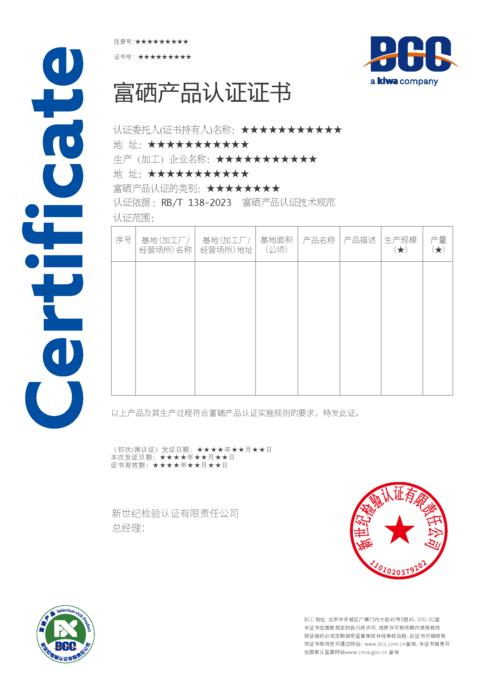 富硒產(chǎn)品認(rèn)證證書有效期最長(zhǎng)為12個(gè)月。獲證組織應(yīng)至少在認(rèn)證證書有效期結(jié)束前3個(gè)月向BCC提出再認(rèn)證申請(qǐng)。