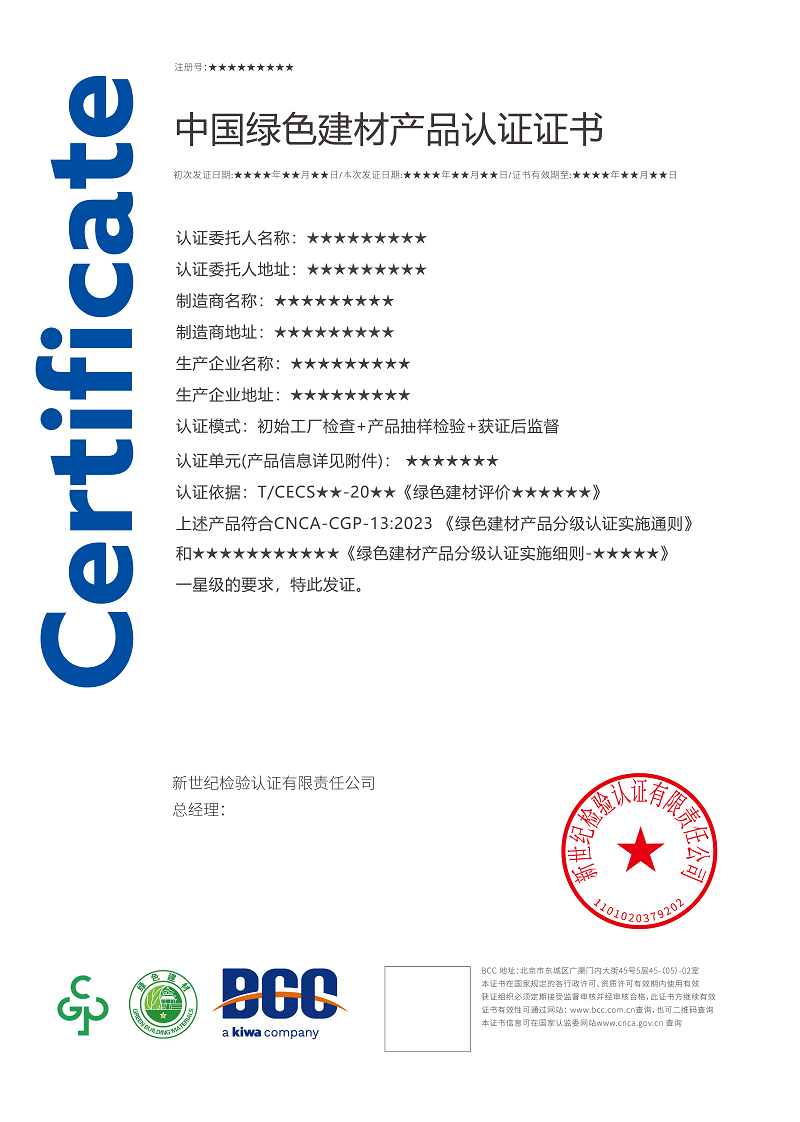 綠色建材產(chǎn)品分級(jí)認(rèn)證按照中國工程建設(shè)標(biāo)準(zhǔn)化協(xié)會(huì)發(fā)布的《綠色建材評(píng)價(jià)標(biāo)準(zhǔn)的要求》,將認(rèn)證結(jié)果由低至高分為一星級(jí)、二星級(jí)和三星級(jí)。
