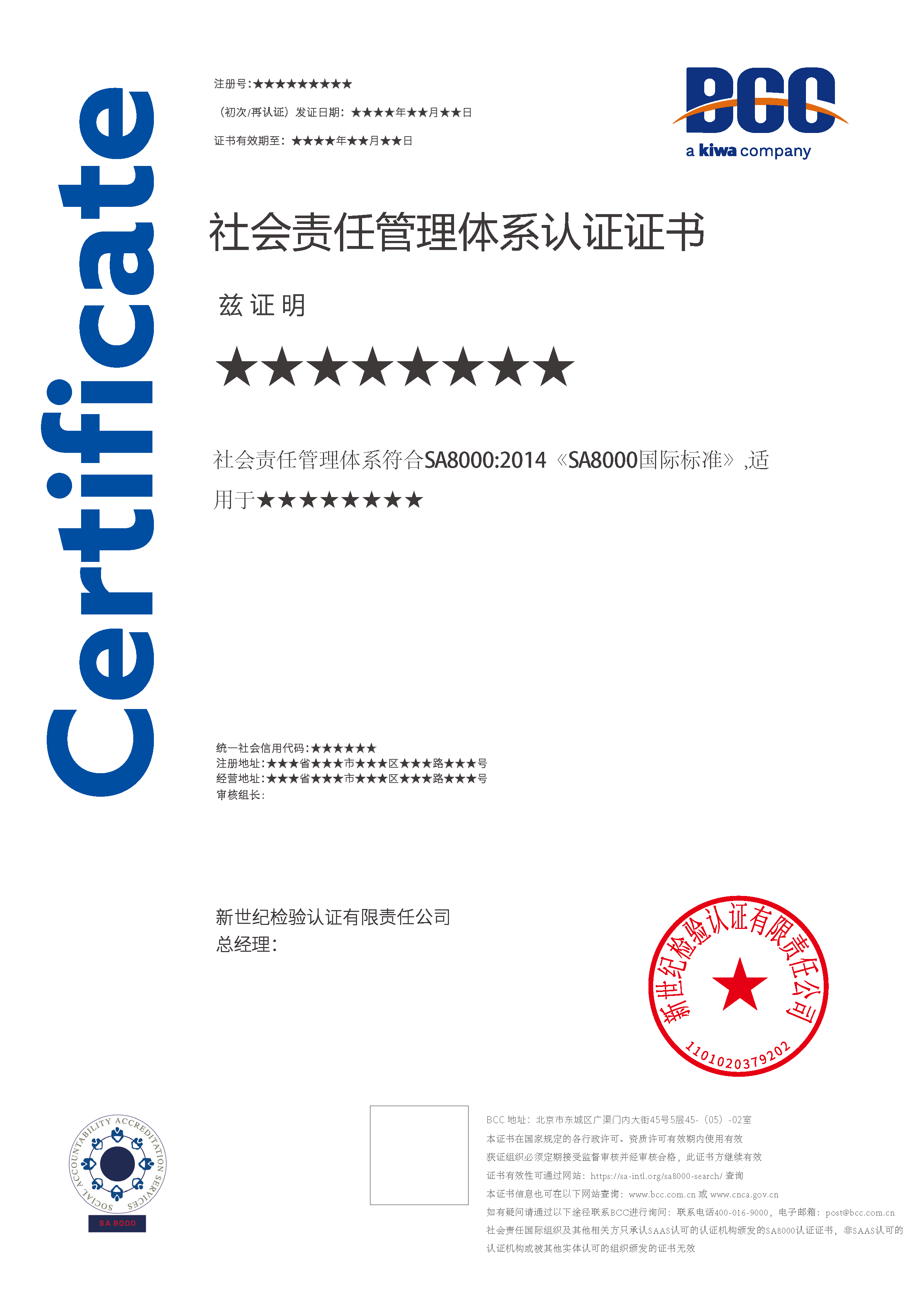 現(xiàn)行SA8000認(rèn)證使用的標(biāo)準(zhǔn)是SA8000:2014,該標(biāo)準(zhǔn)是由美國SAI(社會責(zé)任國際組織)制定發(fā)布的。SA8000標(biāo)準(zhǔn)涵蓋九個方面:童工、強(qiáng)迫勞動、健康與安全、結(jié)社自由及集體談判的權(quán)利、歧視、懲罰措施、工作時間、報酬和管理體系。