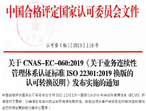 2019年12月31日,中國合格評定國家認可委員會(CNAS)發(fā)布了關(guān)于CNAS-EC-060:2019《關(guān)于業(yè)務(wù)連續(xù)性管理體系認證標準ISO22301:2019換版的認可轉(zhuǎn)換說明》發(fā)布實施的通知。