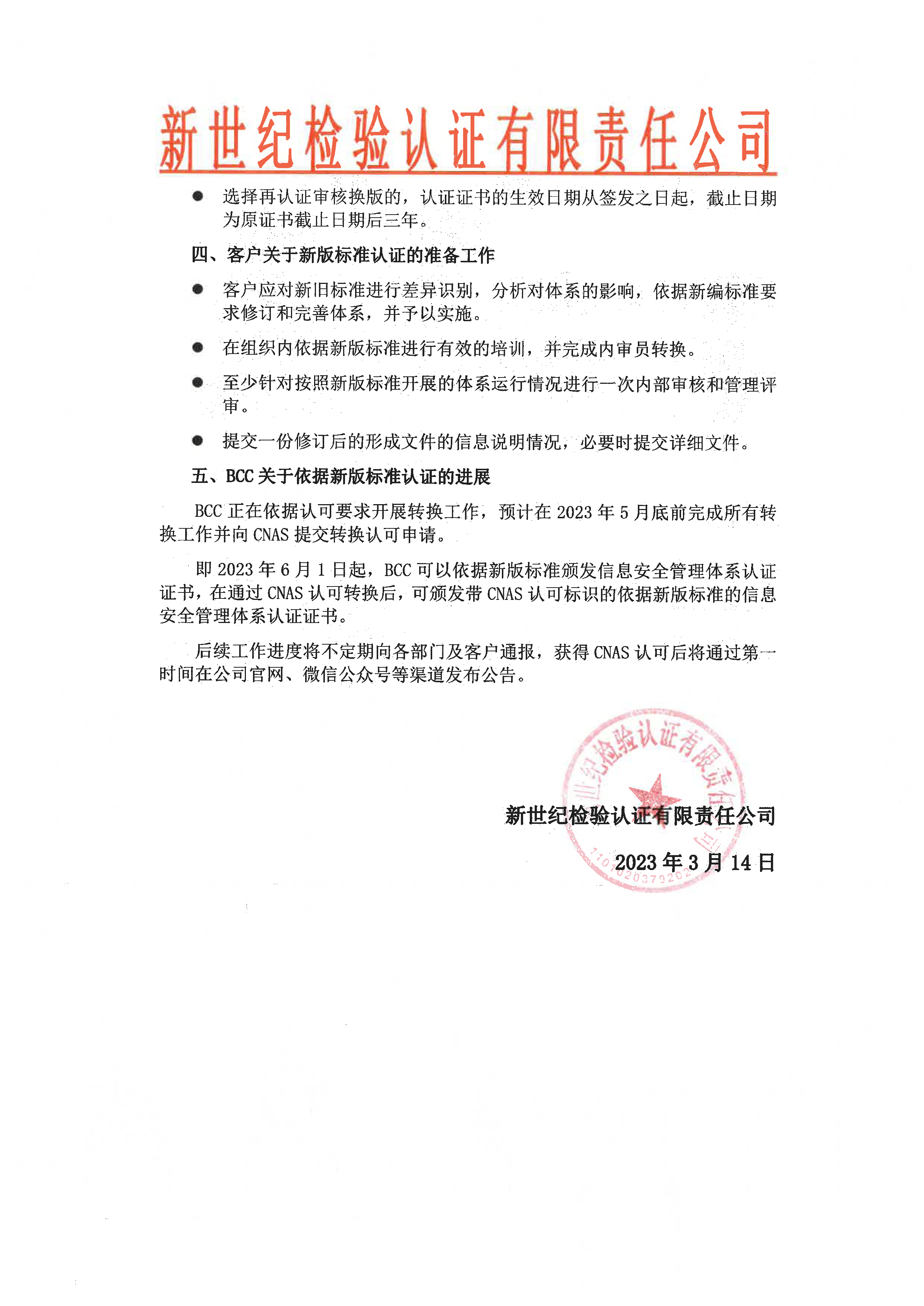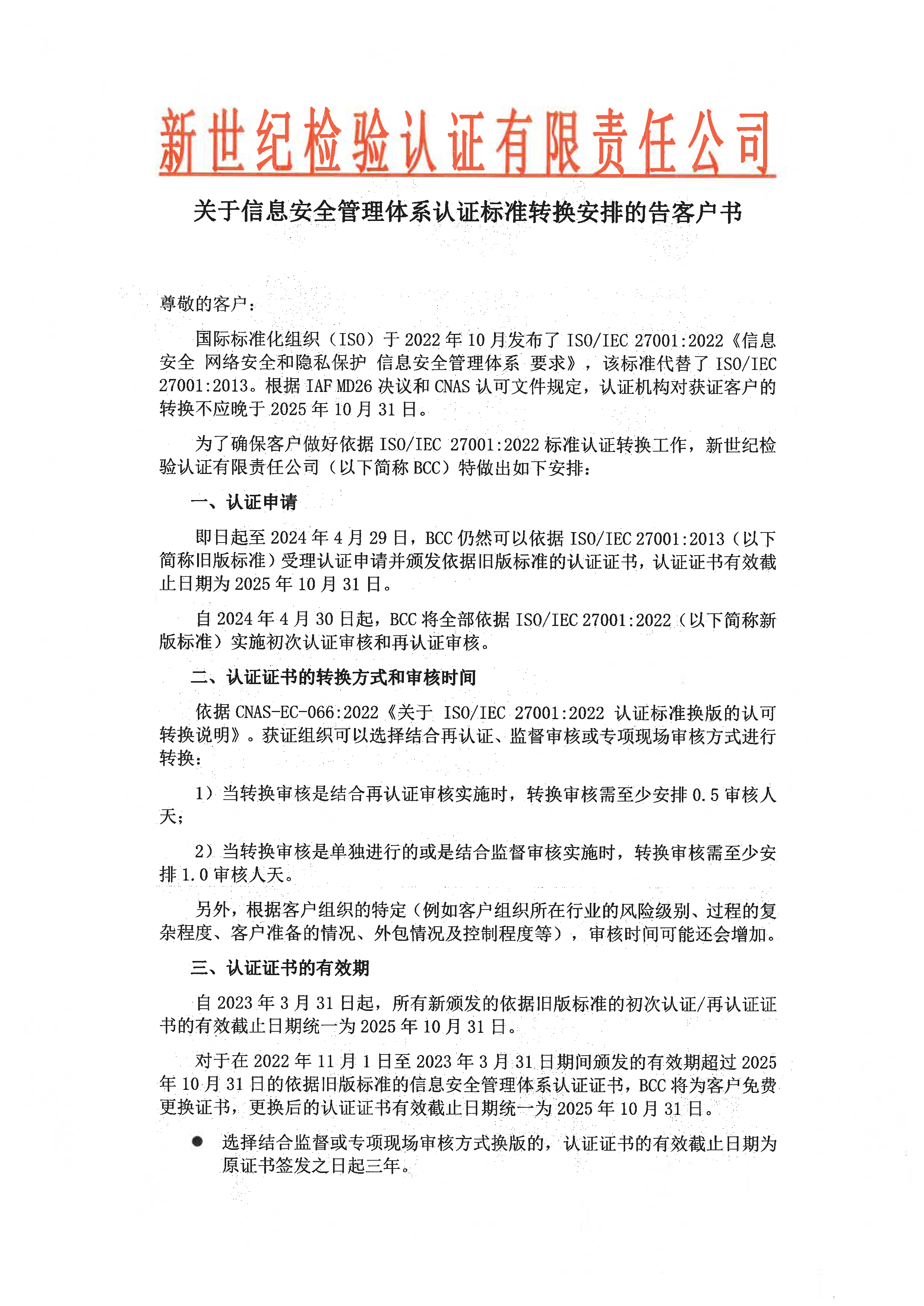 關(guān)于信息安全管理體系認(rèn)證標(biāo)準(zhǔn)轉(zhuǎn)換安排的告客戶書