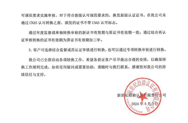2.2024年6月1日起,我公司不再實(shí)施基于舊版認(rèn)可規(guī)范的審核,開始按照新版認(rèn)可規(guī)范要求實(shí)施審核,對于符合新版認(rèn)可規(guī)范要求的,換發(fā)新版認(rèn)證證書。在我公司未通過CNAS認(rèn)可轉(zhuǎn)換之前,頒發(fā)的證書不帶CNAS認(rèn)可標(biāo)志。