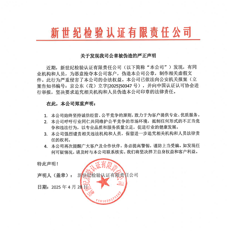 近期,新世紀(jì)檢驗(yàn)認(rèn)證有限責(zé)任公司(以下簡(jiǎn)稱 “本公司 ” )發(fā)現(xiàn),有同業(yè)機(jī)構(gòu)和人員,為惡意搶奪本公司客戶,偽造本公司公章,制作相關(guān)虛假文件。此行為嚴(yán)重侵害了本公司的合法權(quán)益。本公司已依法向公安機(jī)關(guān)報(bào)案(立案告知書(shū)編號(hào): 京公東(花)立字[2025]50347號(hào)),并向中國(guó)認(rèn)證認(rèn)可協(xié)會(huì)進(jìn)行舉報(bào),堅(jiān)決要求追究相關(guān)機(jī)構(gòu)和人員偽造本公司印章的法律責(zé)任。